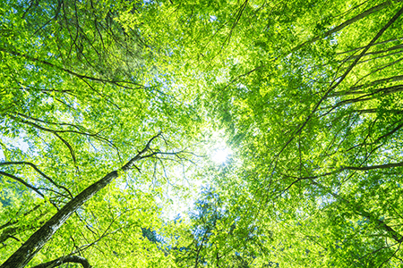 「間伐」と呼ばれる間引き作業を行い、林内環境をよくして樹木が健康に育つようにします。間伐をすることにより地面に日光が差し込み、さまざまな草木が新たに生え、それを食料とする昆虫や鳥が生育するようになるなど生物の多様性が向上します。